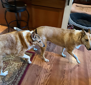 She is REAL easy to walk. I can take both dogs together without trouble. No pulling and stayed on one side, so the leashes didn’t get tangled. Off leash she stayed next to me, even though I started walking with another walker with her dog. All three were off the leash on the back side of the pond. She walked with us and the other two dogs were more interested in what smells and mischief they could find."