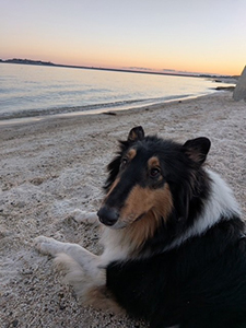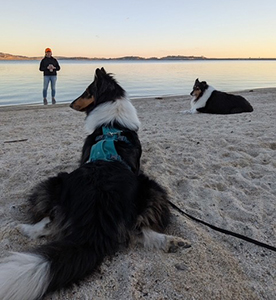 enjoying walks on the beach with his 5 year old Collie sister Lilly.